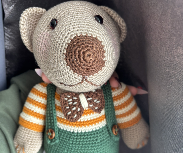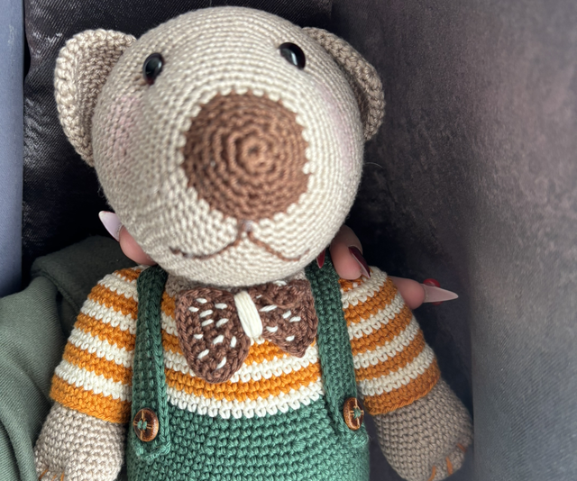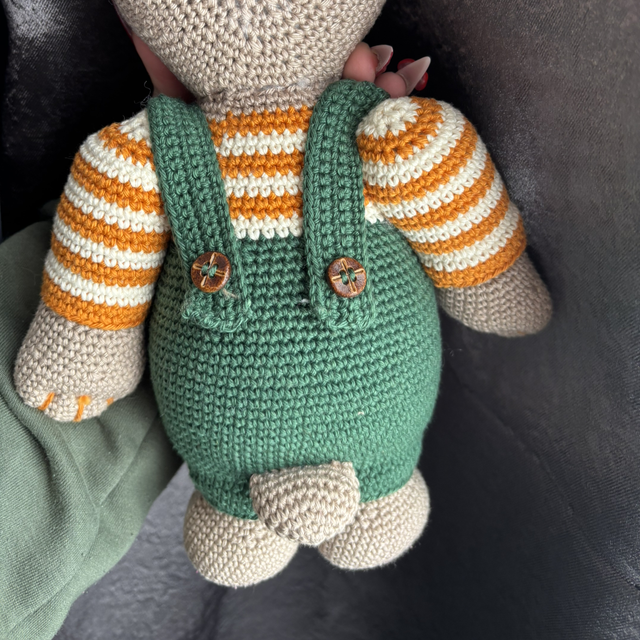 Rencontrez Gustave, un ours élégant au style vintage, crocheté à la main avec passion. Avec sa salopette verte, son pull rayé et son nœud papillon tricoté, il apportera une touche de douceur et d’originalité dans une chambre d’enfant ou une collection artisanale.