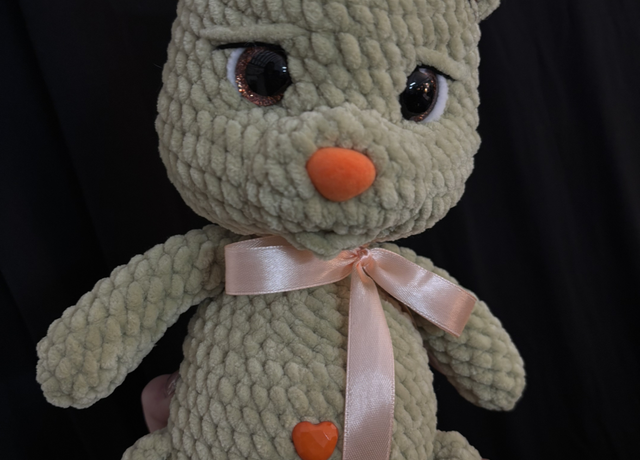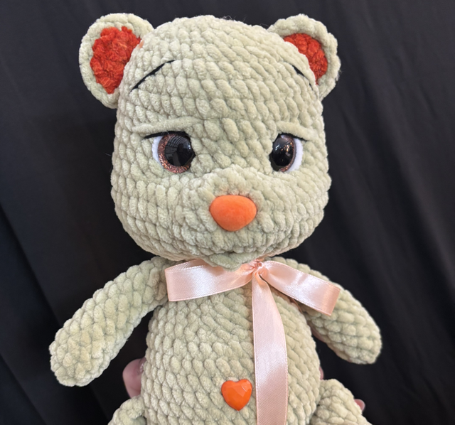 je suis faite en laine chenille avec un rembourrage anti allergène, fait avec beaucoup d’amour.