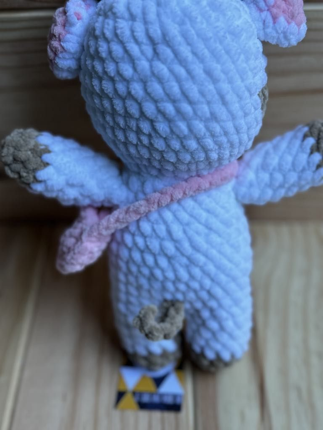 Petite vache debout blanche/marron et du rose.